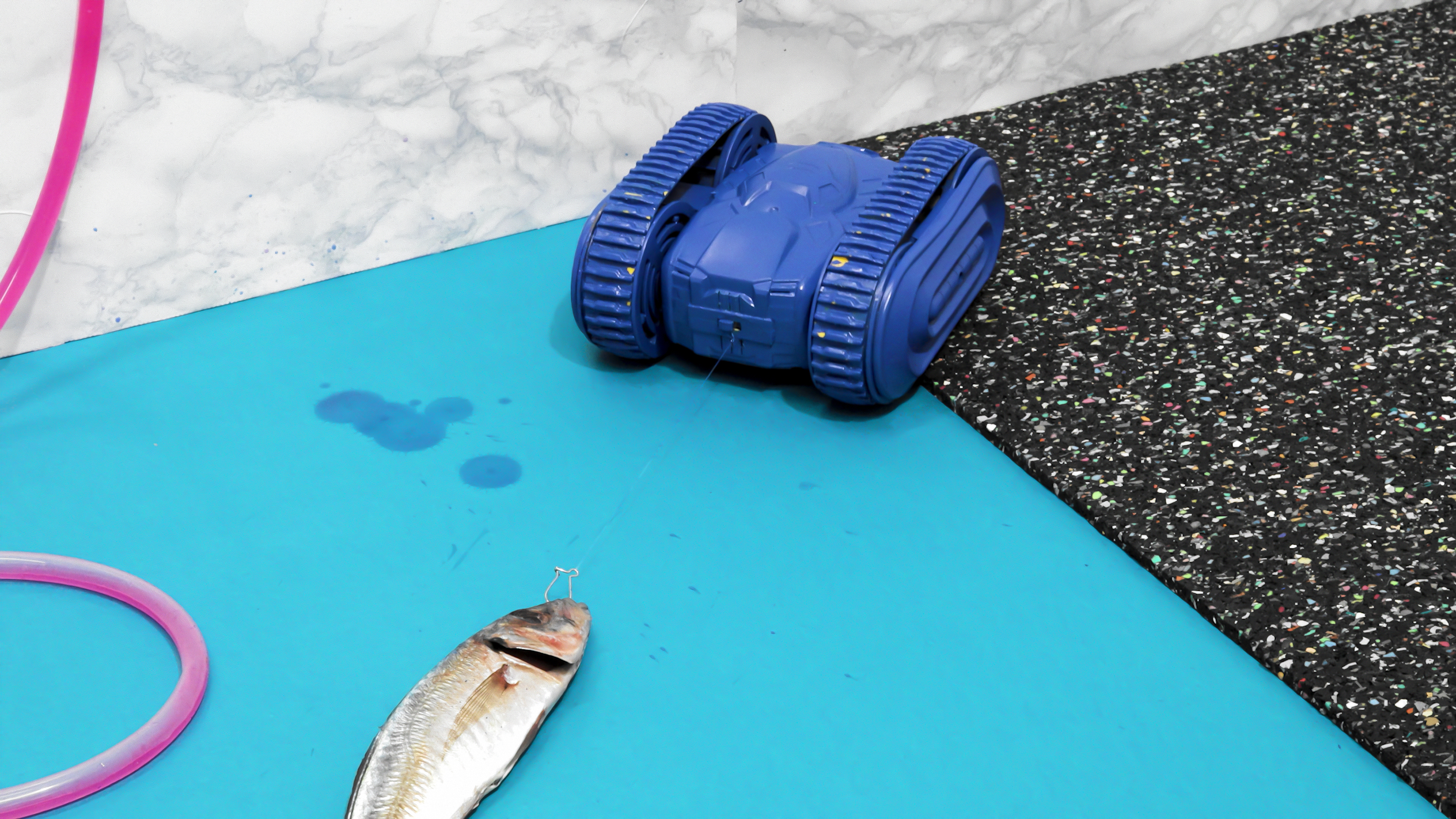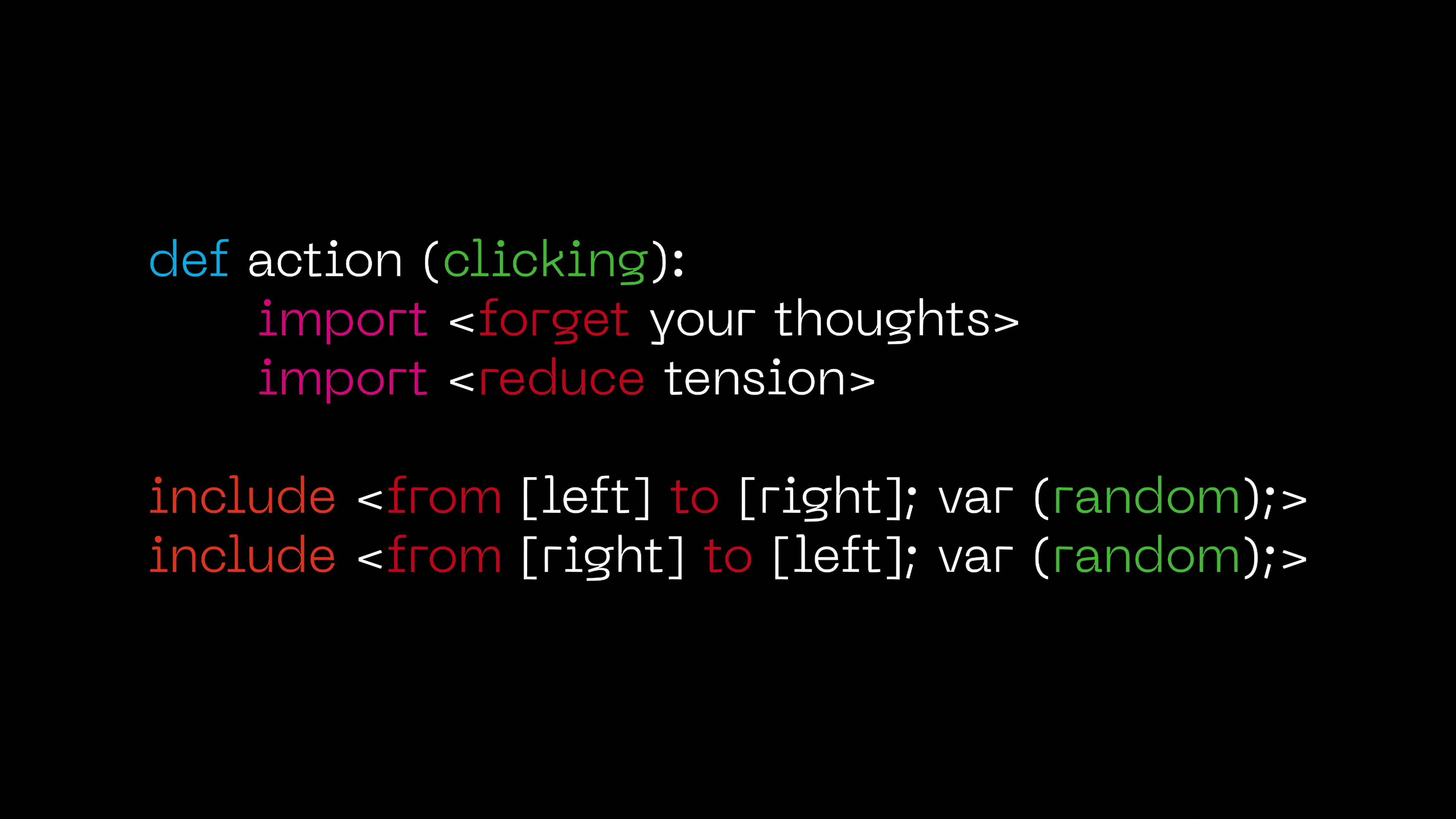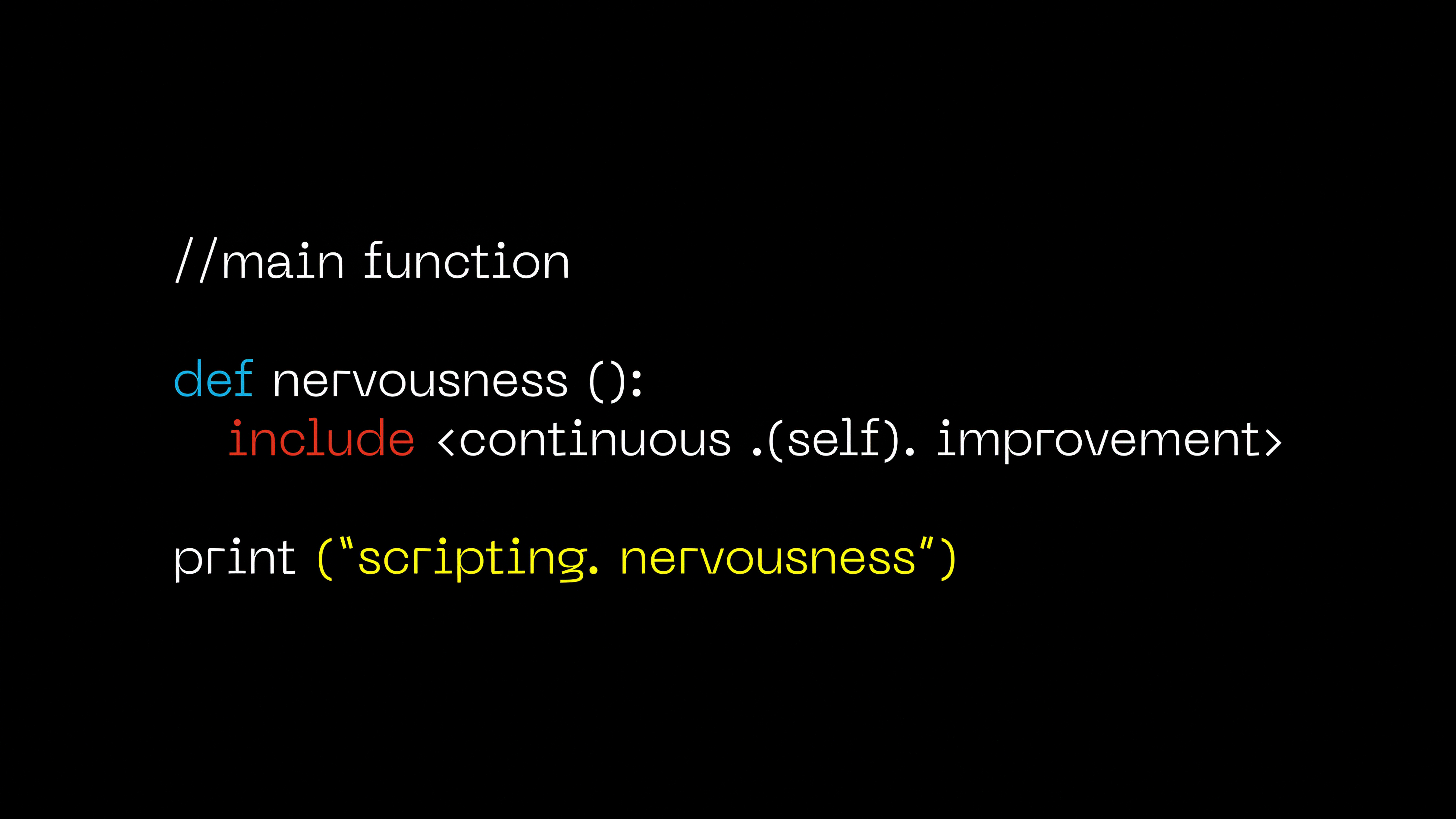 ︎The video ‘Scripting Nervousness,’ responds to the psychometric approaches of the body; it attempts to expose the madness of data-driven self-improvement and the way in which these create feelings of anxiety and nervousness. To produce and simulate the emotions that arise, I construct different absurd scenes by decontextualizing everyday objects: a desktop screen depicts a dead fish that is slowly dragged by a car to through a field of dry flowers, revealing the sentence ‘continuous self-improvement’ underneath; a non-functional code highlights the arbitrary convention of software language.